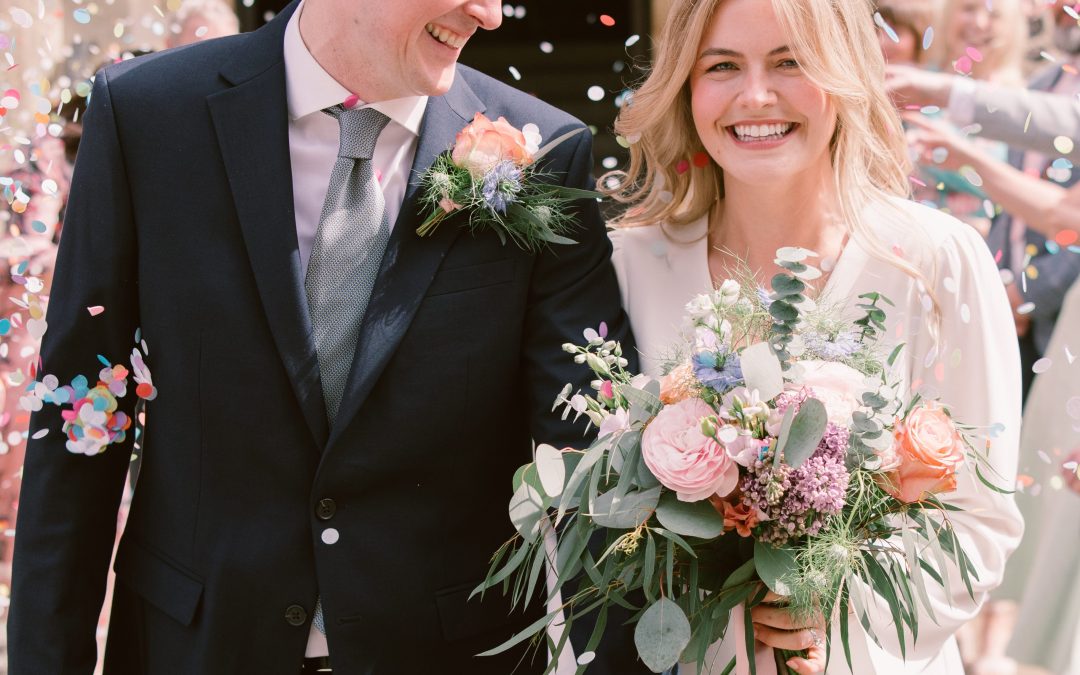 Hampshire Wedding Photographer Lucylou Photography- couple smiling walking through confetti by admin | Sep 15, 2025 Save