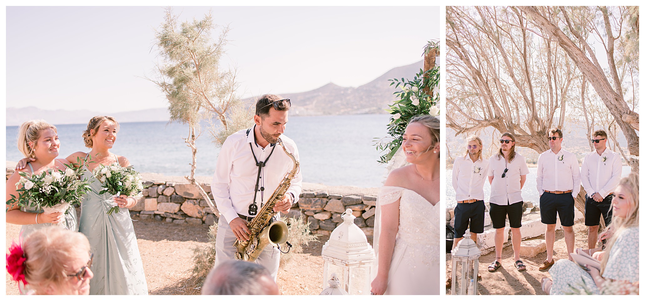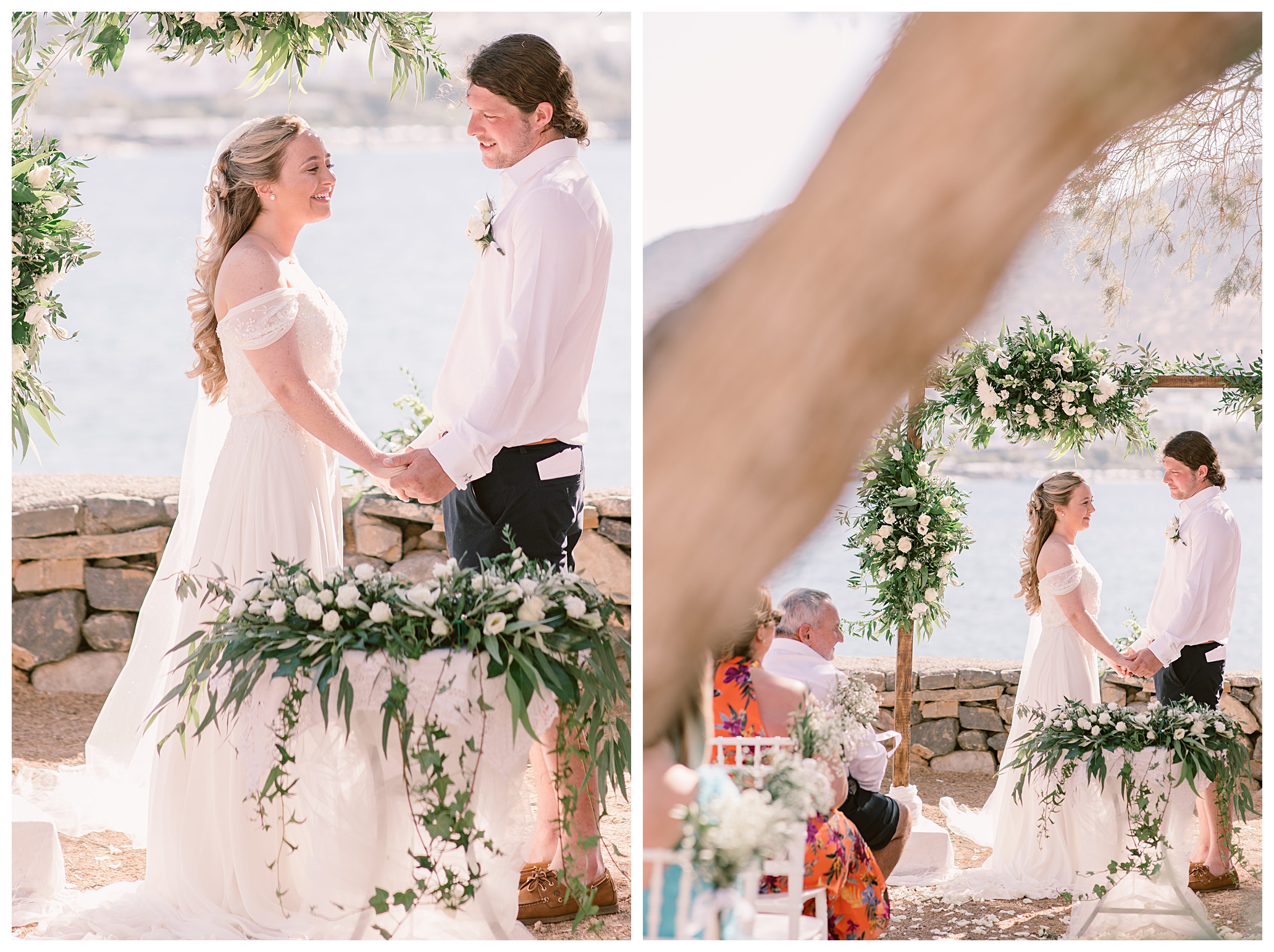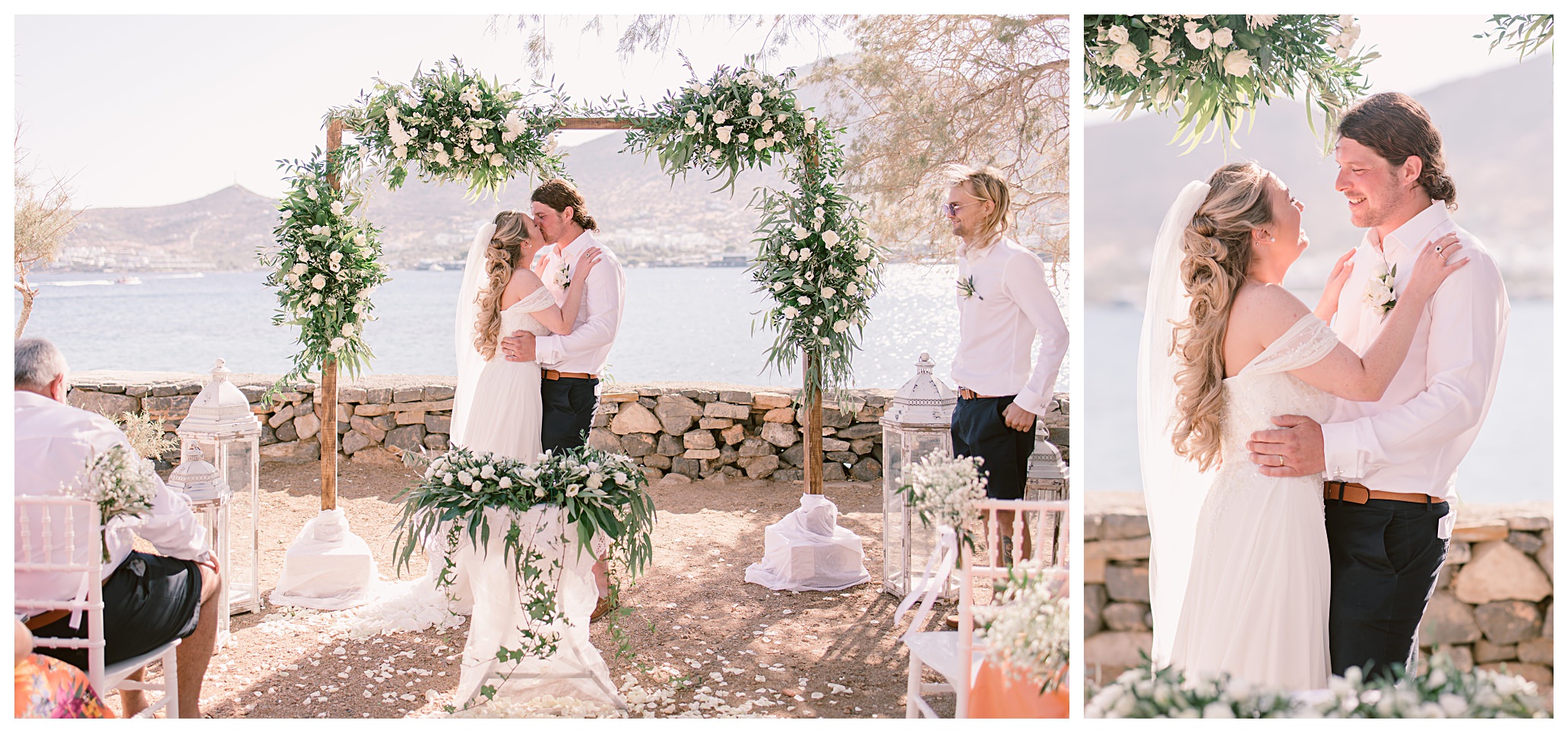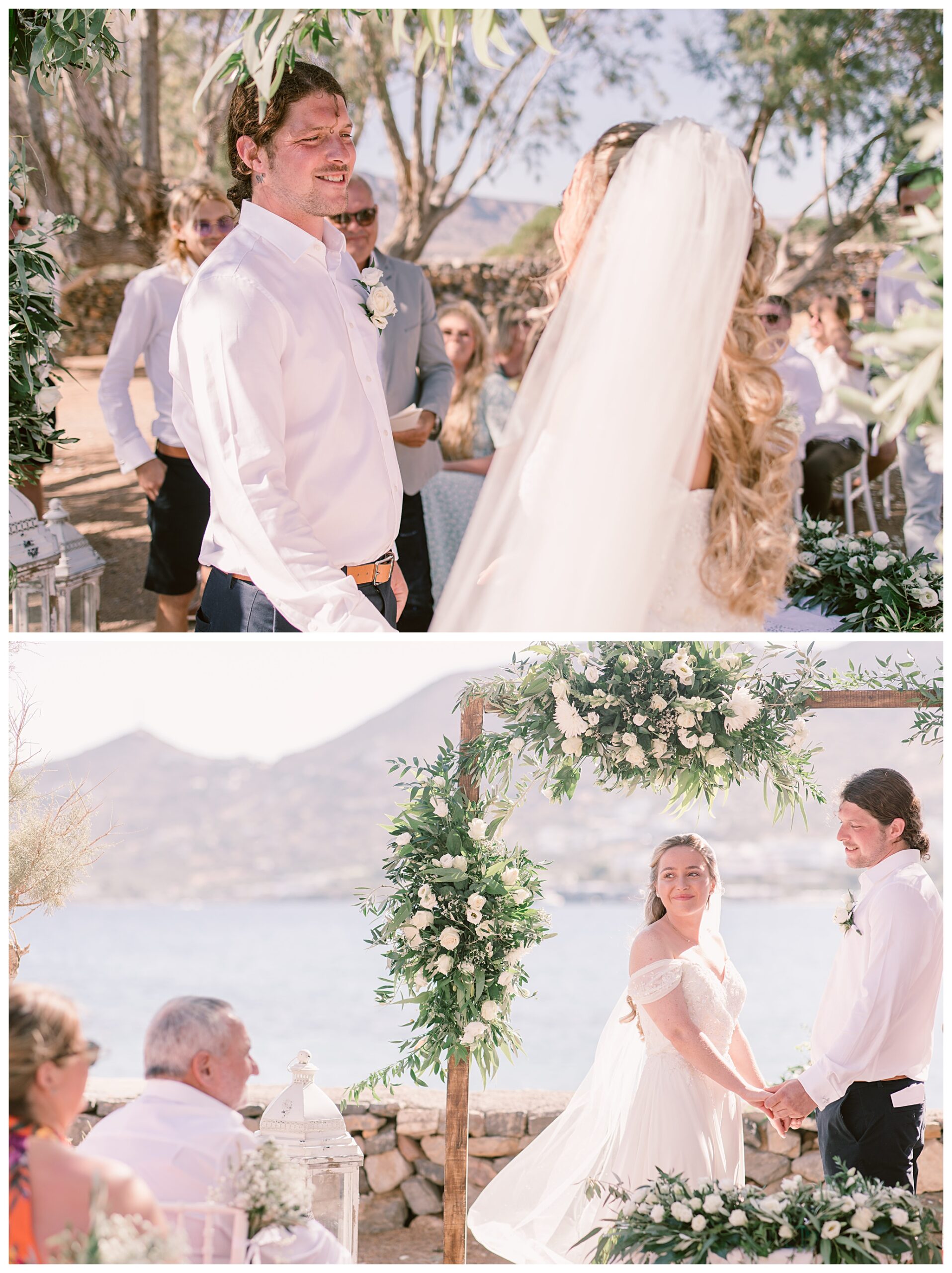 On the day of the wedding the weather was glorious, blue skies and sunshine, plus warm weather. Daisy & Dan both got ready separately at the hotel they were staying in – Tui Blue Elounda Village then went on to Analipsi Chapel for a beautiful outdoor ceremony with the most stunning coastal backdrop.
