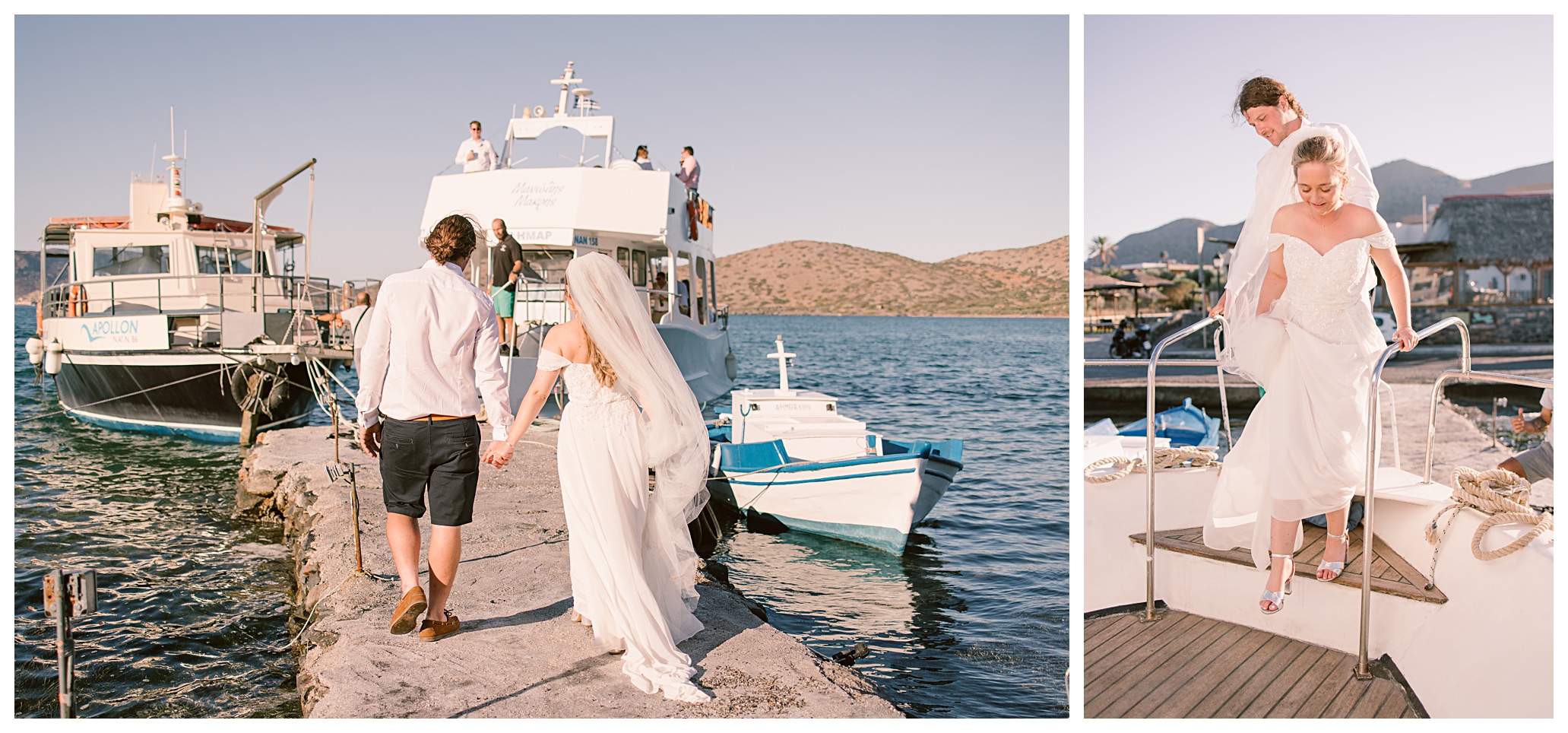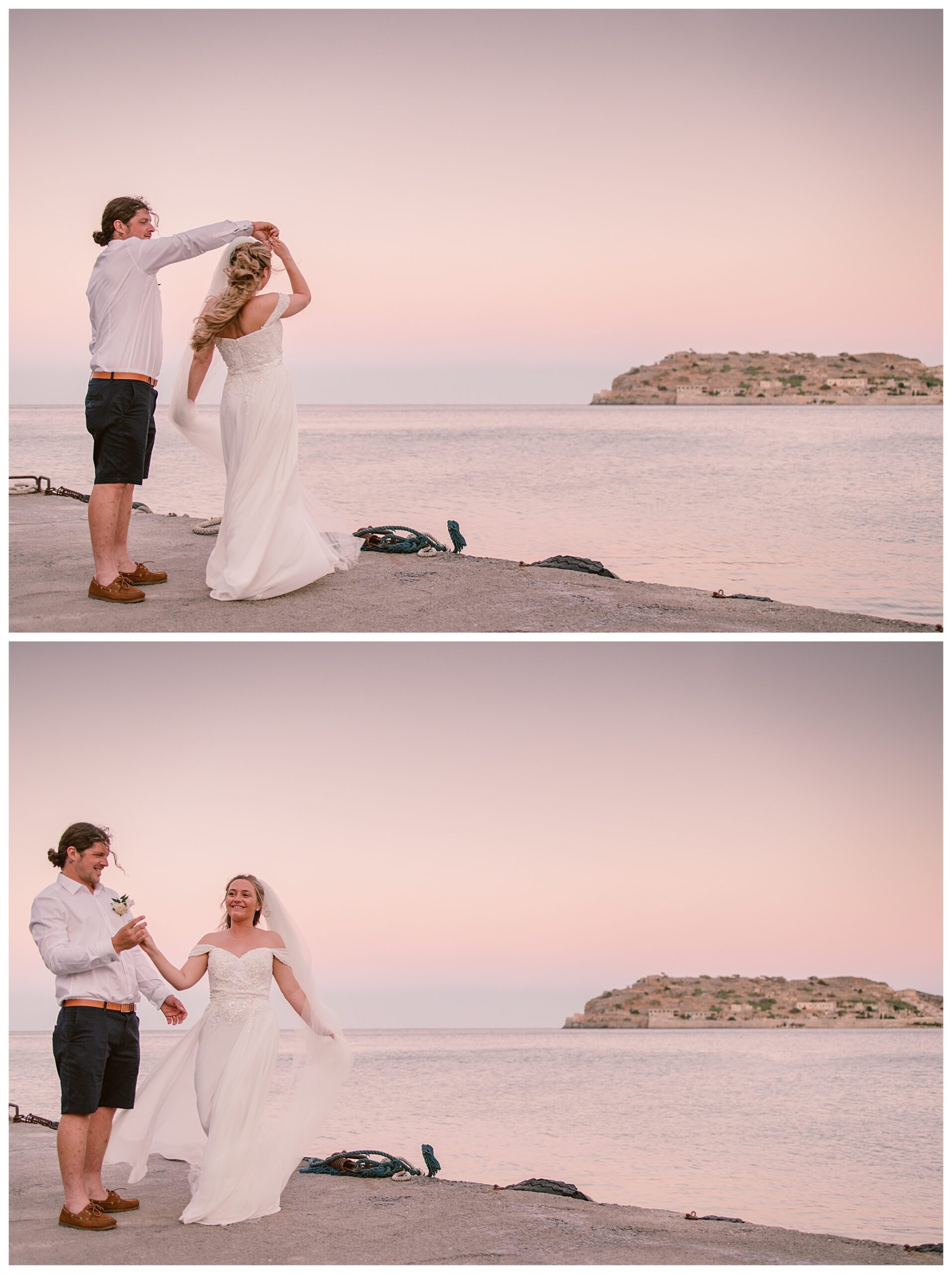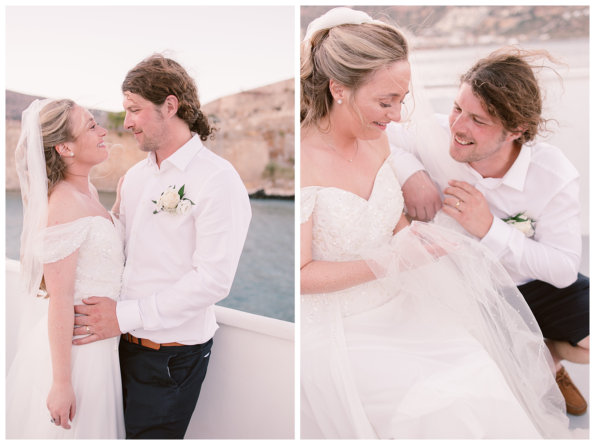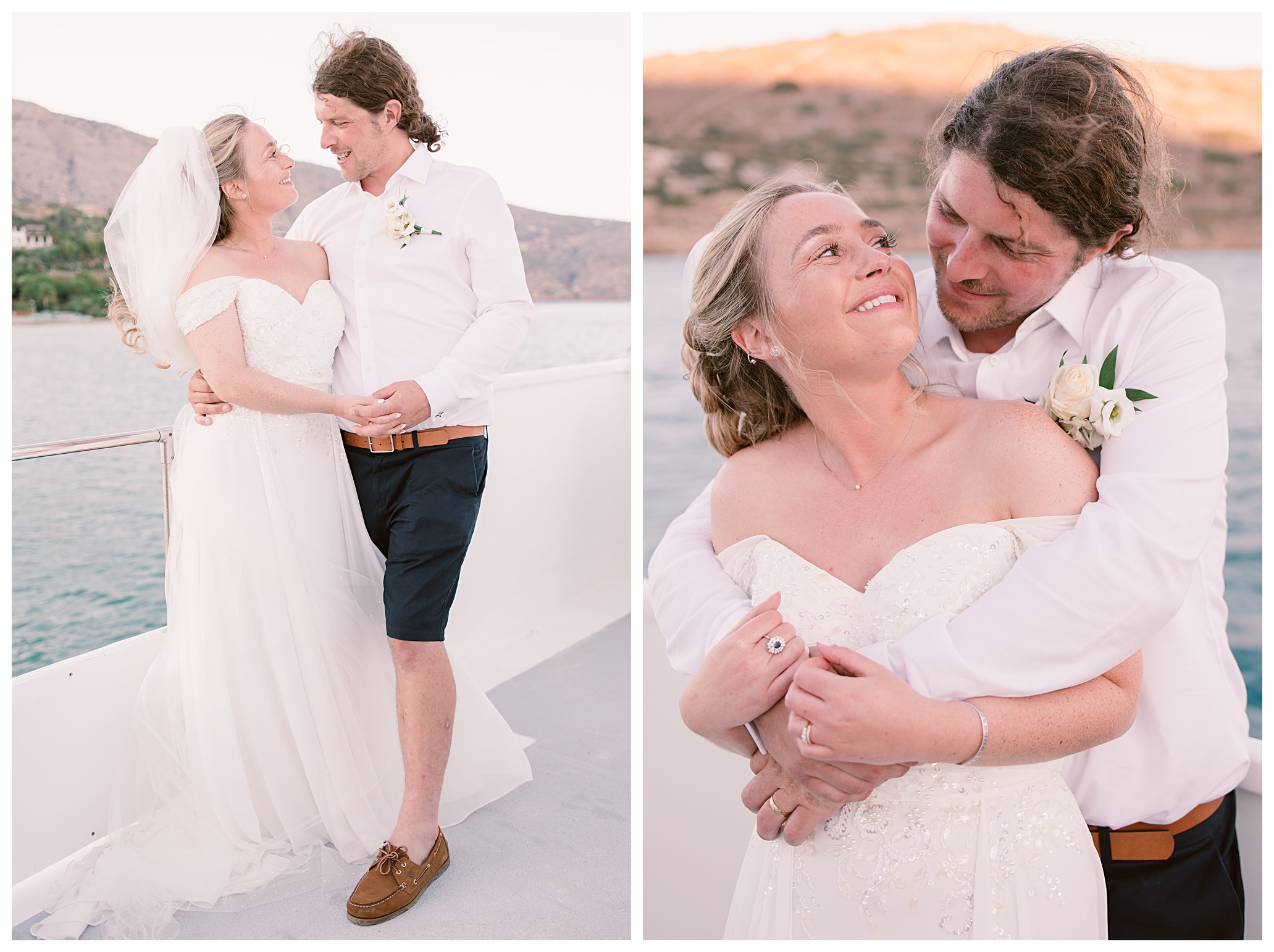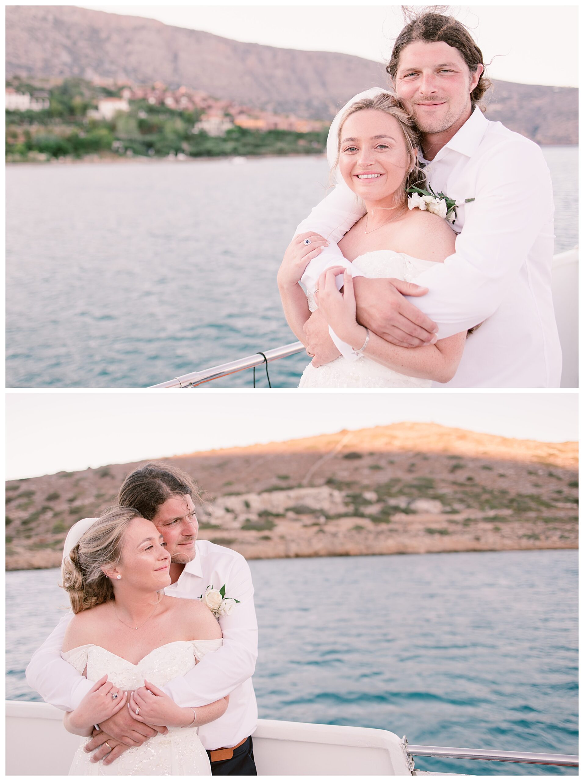 After having some reception drinks and photos at the ceremony site, we were walking towards the boat that Dan & Daisy were going on to sail around Elounda, but on the way I came across an enormous puddle that I thought would make a great setting for some photos because I could visualise in my head how it was going to look with the amazing setting they were in with the see and mountains as a backdrop and then their reflection in the water across the puddle. It’s funny though, as Dan & Daisy said that they’d seen the puddle the day before and were hoping that it wouldn’t be there for their wedding day but were amazed and pleased that the huge puddle hadn’t gone when I showed them the back of the camera with the photos I’d just captured there.