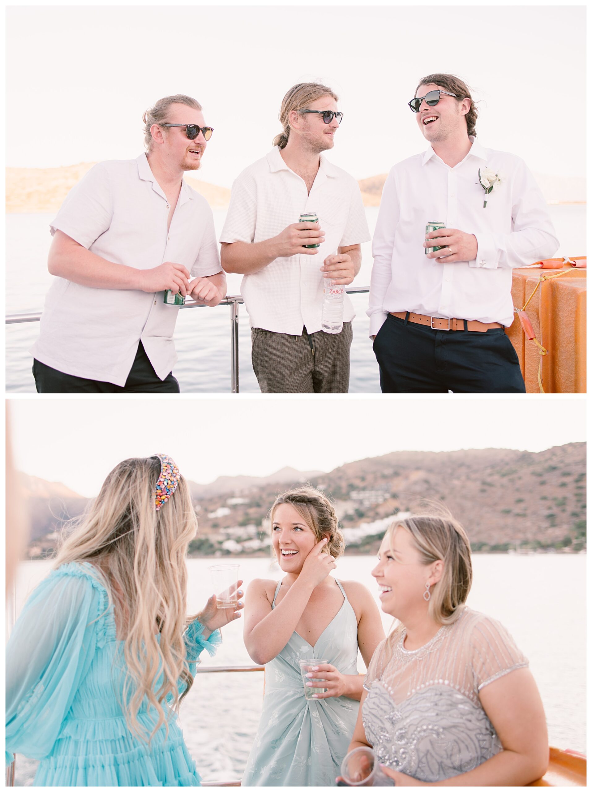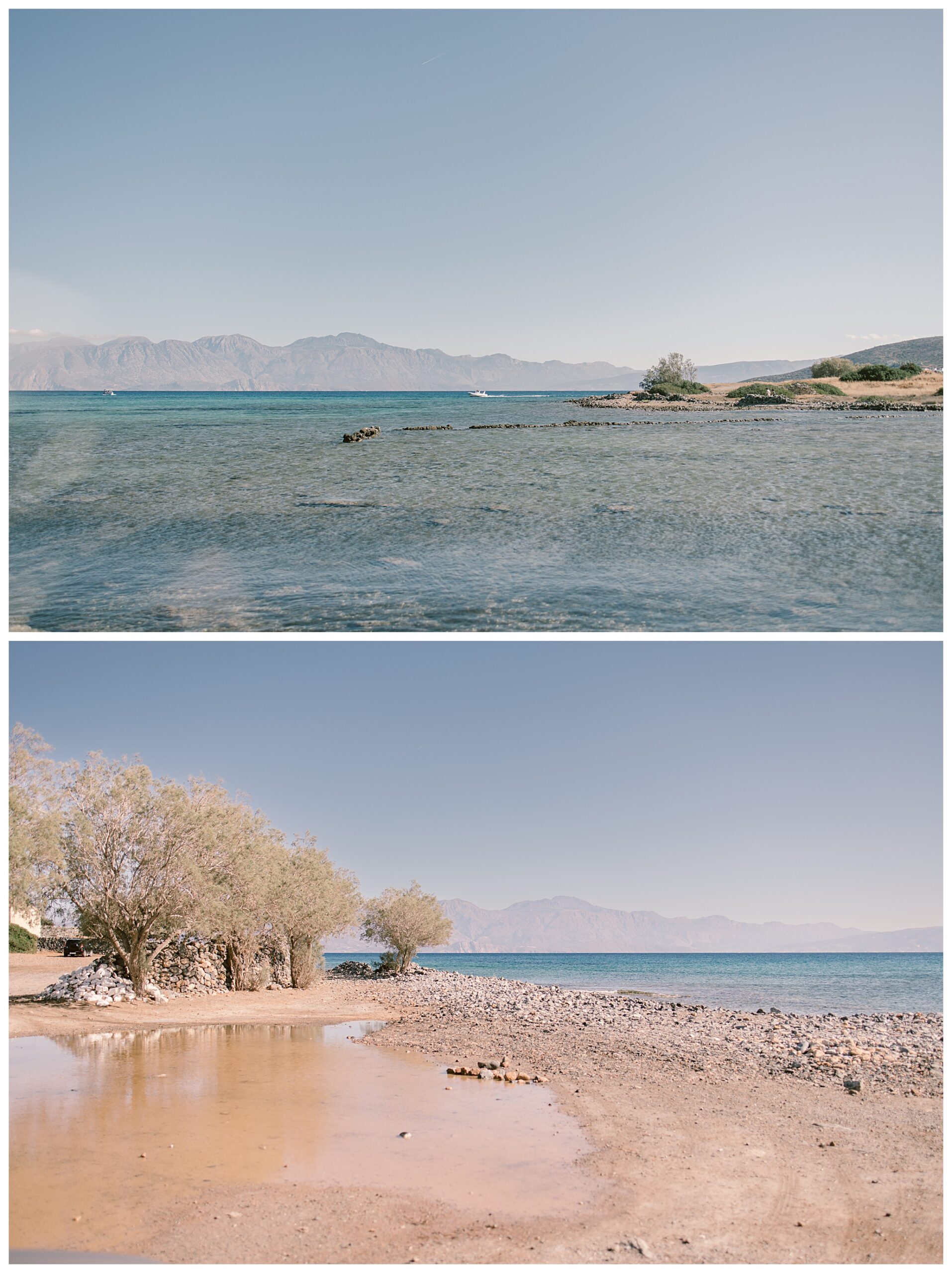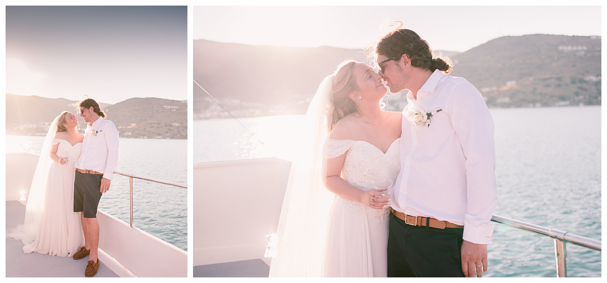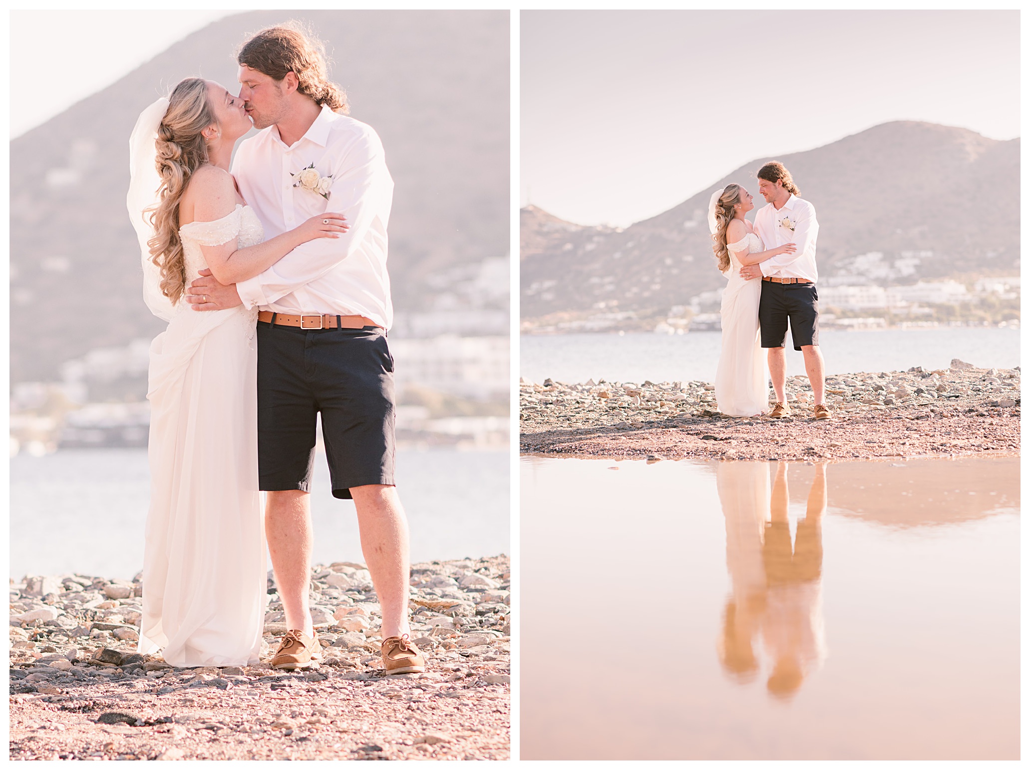 After having some reception drinks and photos at the ceremony site, we were walking towards the boat that Dan & Daisy were going on to sail around Elounda, but on the way I came across an enormous puddle that I thought would make a great setting for some photos because I could visualise in my head how it was going to look with the amazing setting they were in with the see and mountains as a backdrop and then their reflection in the water across the puddle. It’s funny though, as Dan & Daisy said that they’d seen the puddle the day before and were hoping that it wouldn’t be there for their wedding day but were amazed and pleased that the huge puddle hadn’t gone when I showed them the back of the camera with the photos I’d just captured there.