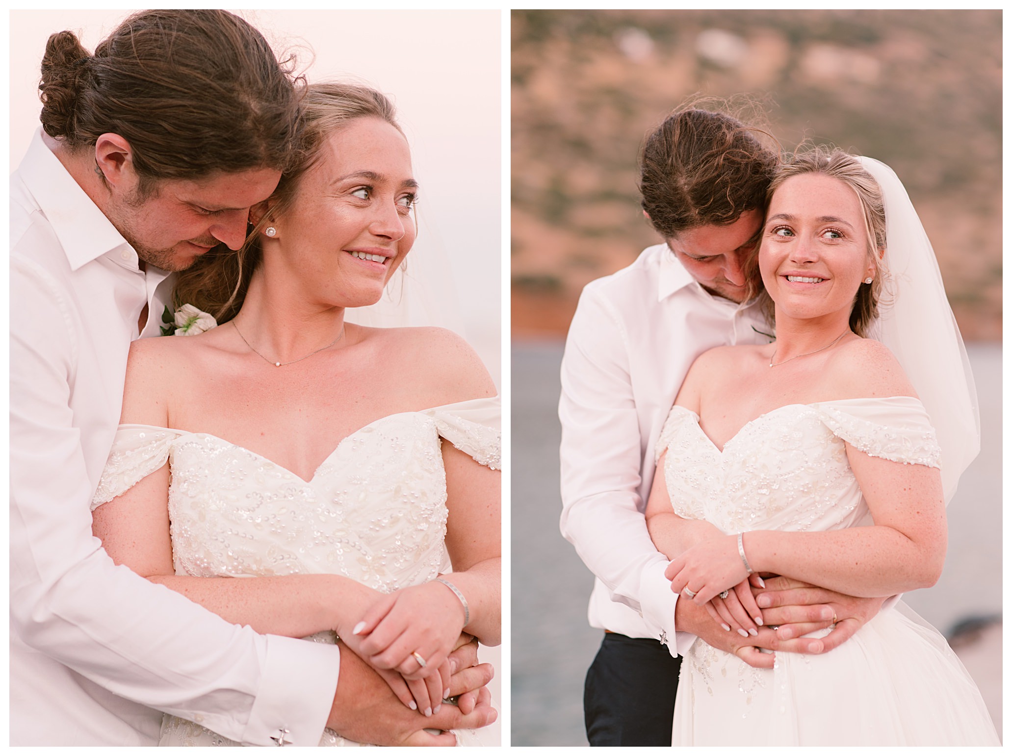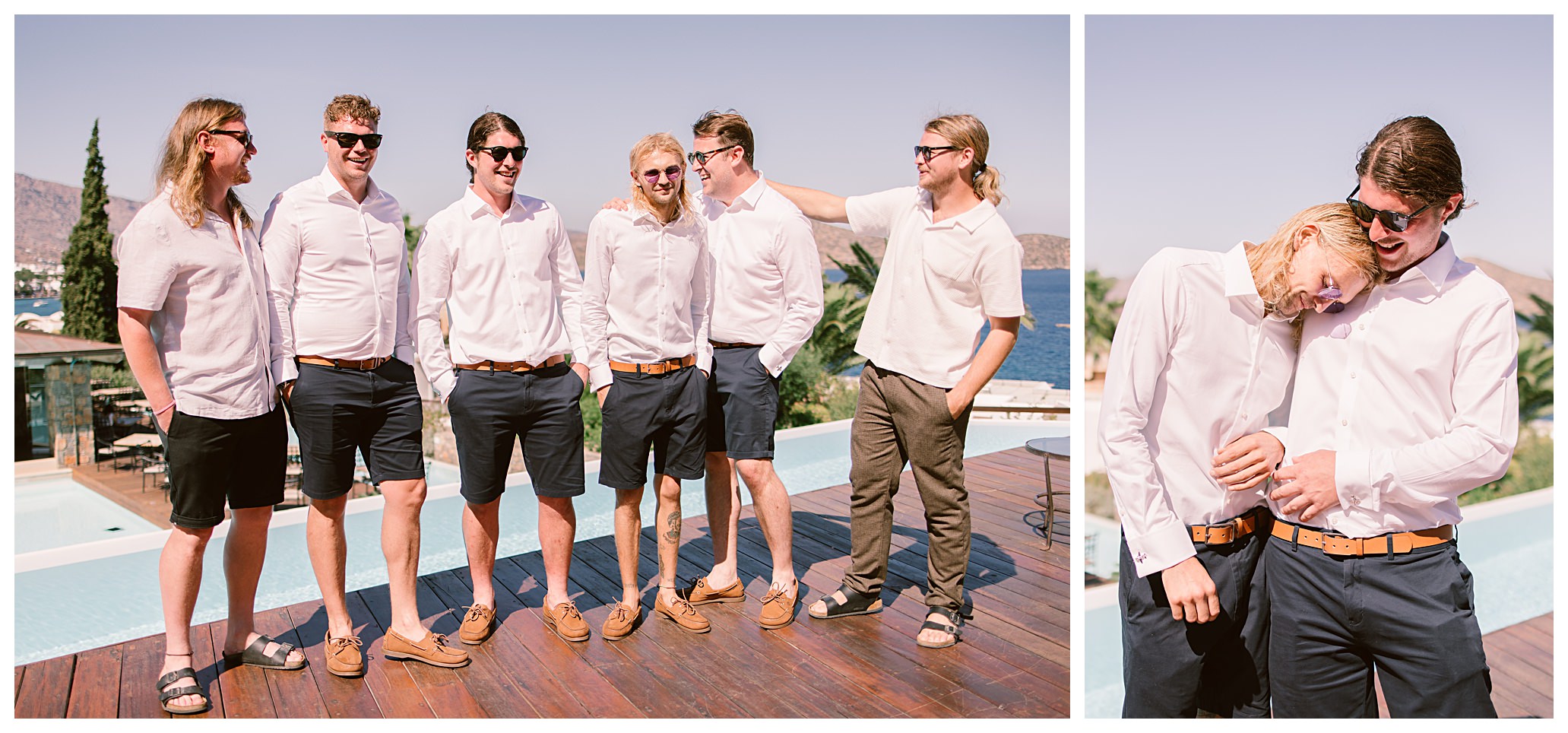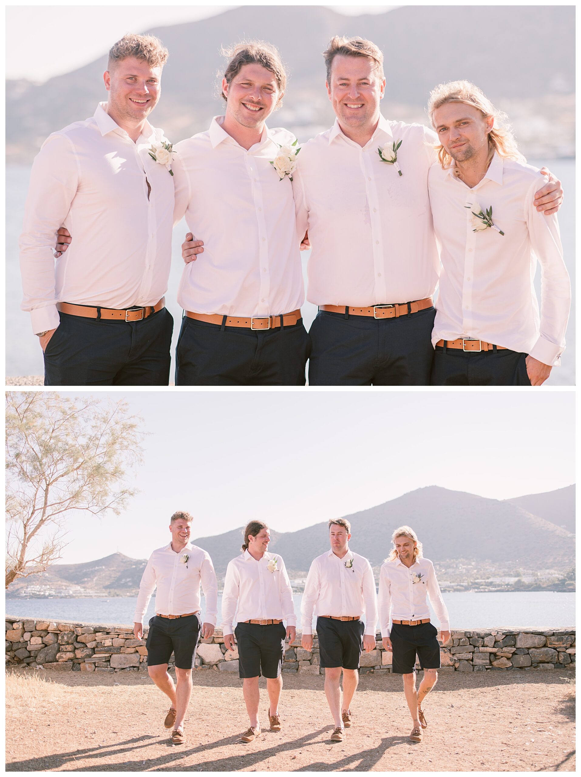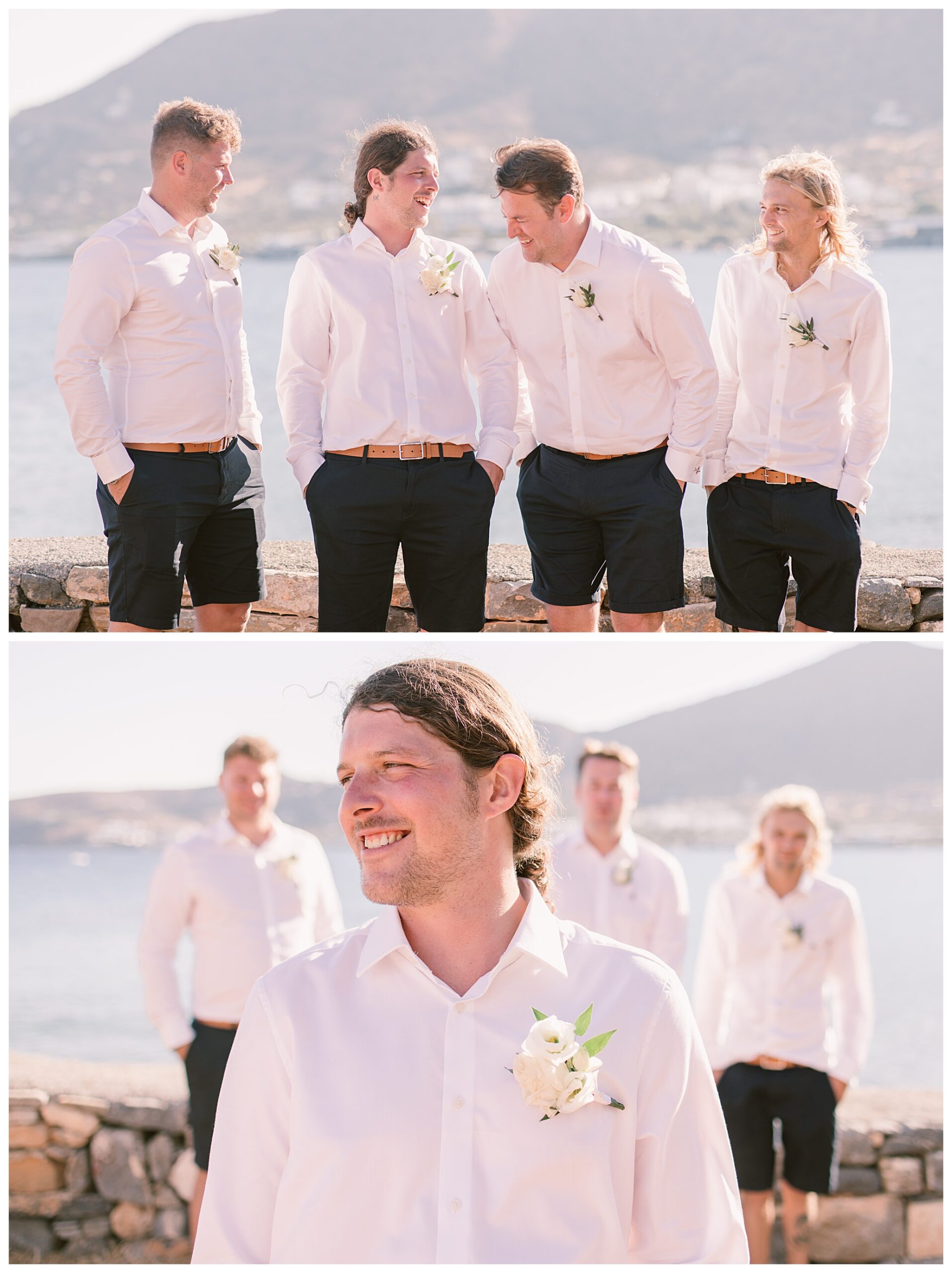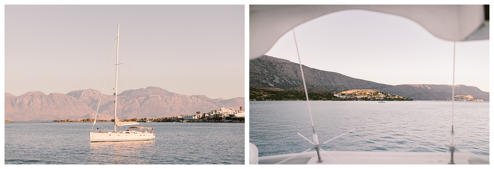 After having some reception drinks and photos at the ceremony site, we were walking towards the boat that Dan & Daisy were going on to sail around Elounda, but on the way I came across an enormous puddle that I thought would make a great setting for some photos because I could visualise in my head how it was going to look with the amazing setting they were in with the see and mountains as a backdrop and then their reflection in the water across the puddle. It’s funny though, as Dan & Daisy said that they’d seen the puddle the day before and were hoping that it wouldn’t be there for their wedding day but were amazed and pleased that the huge puddle hadn’t gone when I showed them the back of the camera with the photos I’d just captured there.