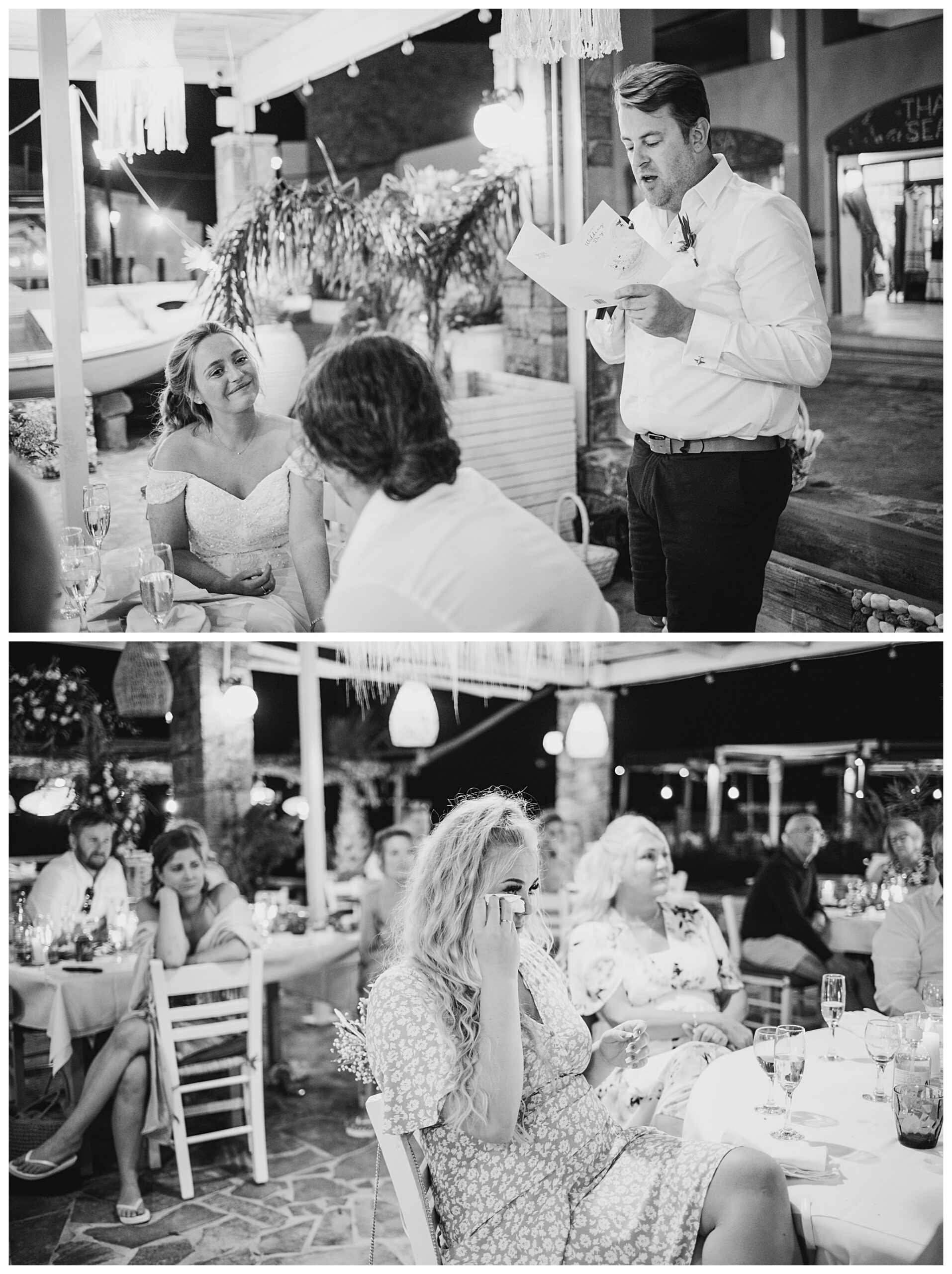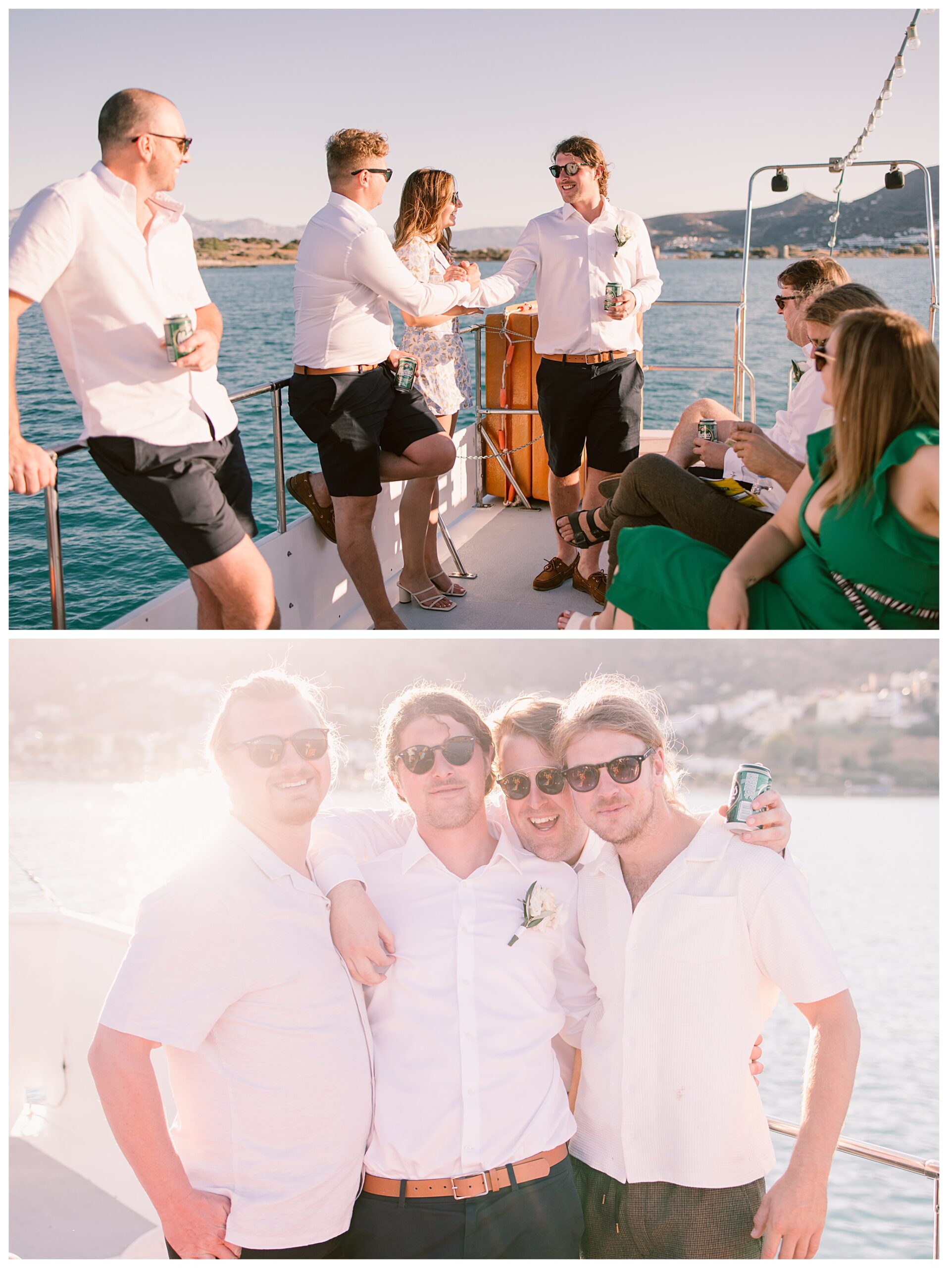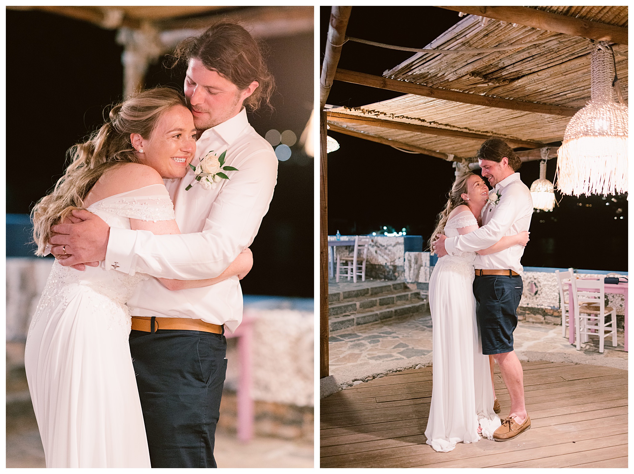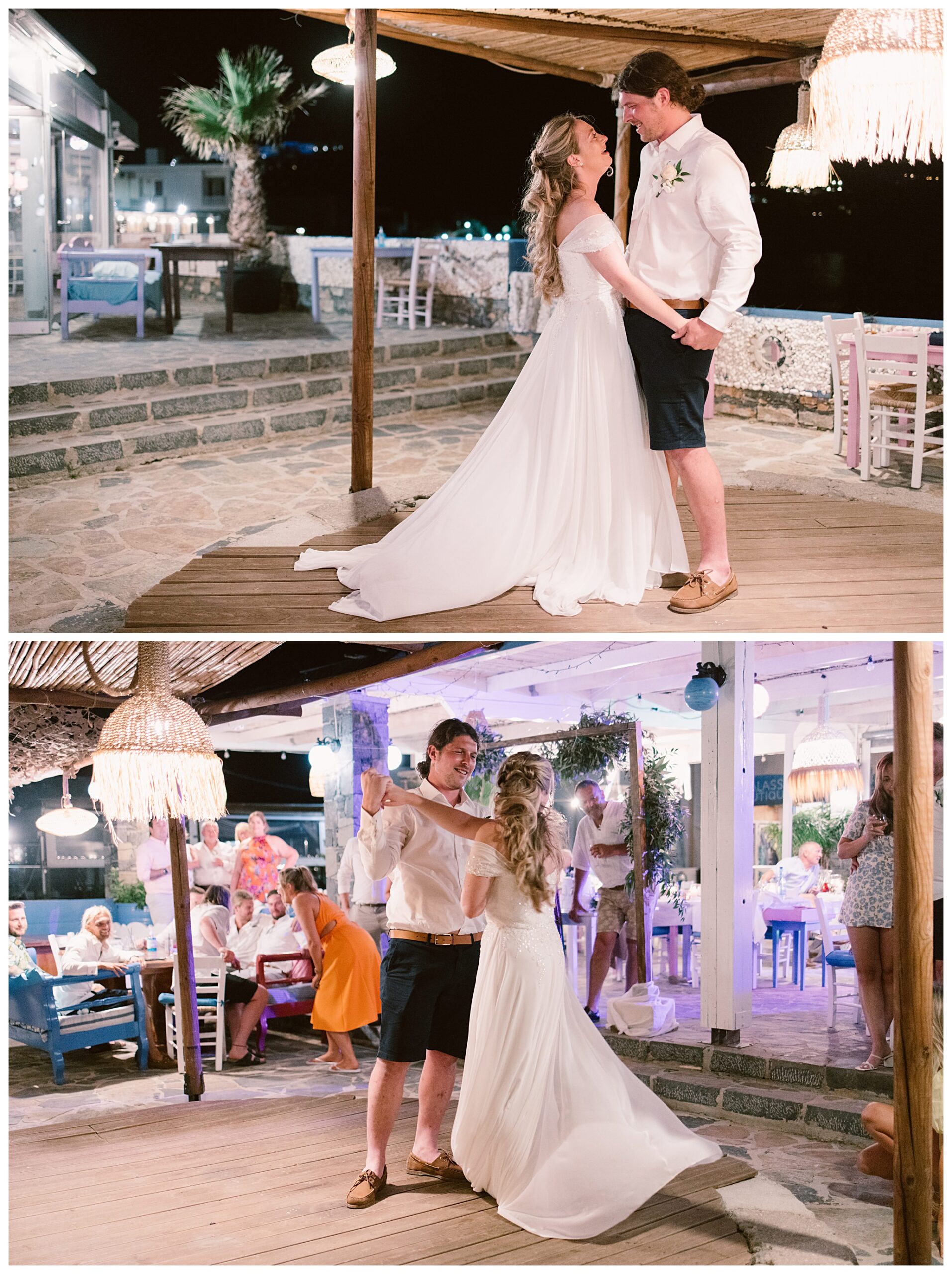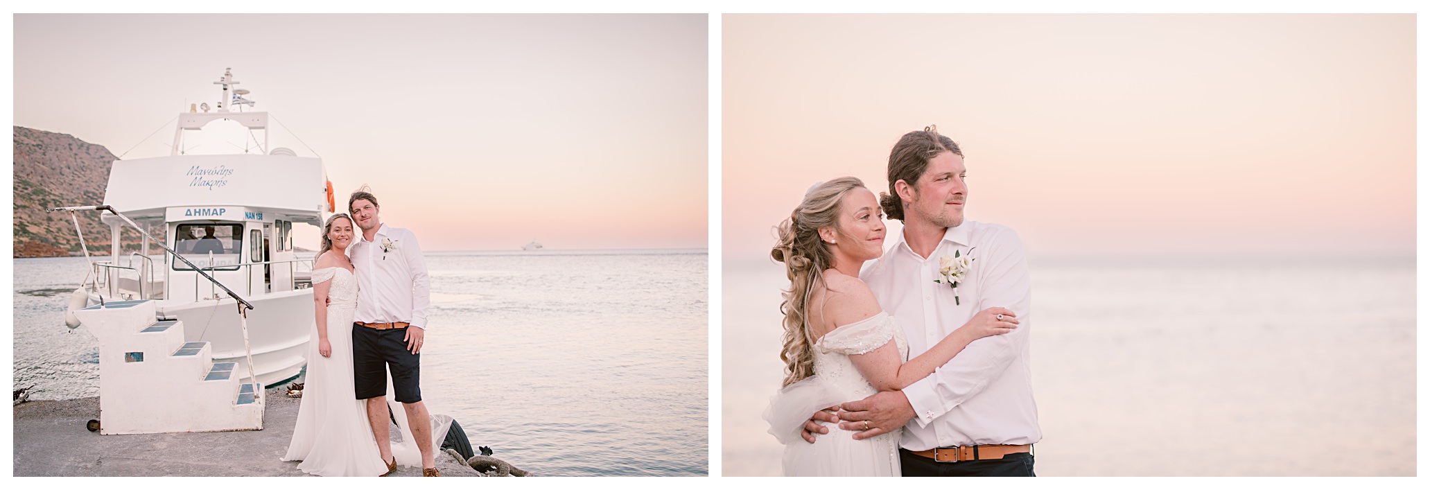 As we unexpectedly ended up spending a bit of time taking some photos by the huge puddle, we were running late for the boat, so Dan & Daisy’s lovely wedding planner, Janet from Crete Weddings drove us to the boat where we sailed for about an hour until we moored up at sunset in Plaka, where Dan & Daisy had their wedding reception at a lovely restaurant on the sea front called Thalassa. They had some delicious traditional Greek food, then did their speeches, cut their cake and then danced the night away.