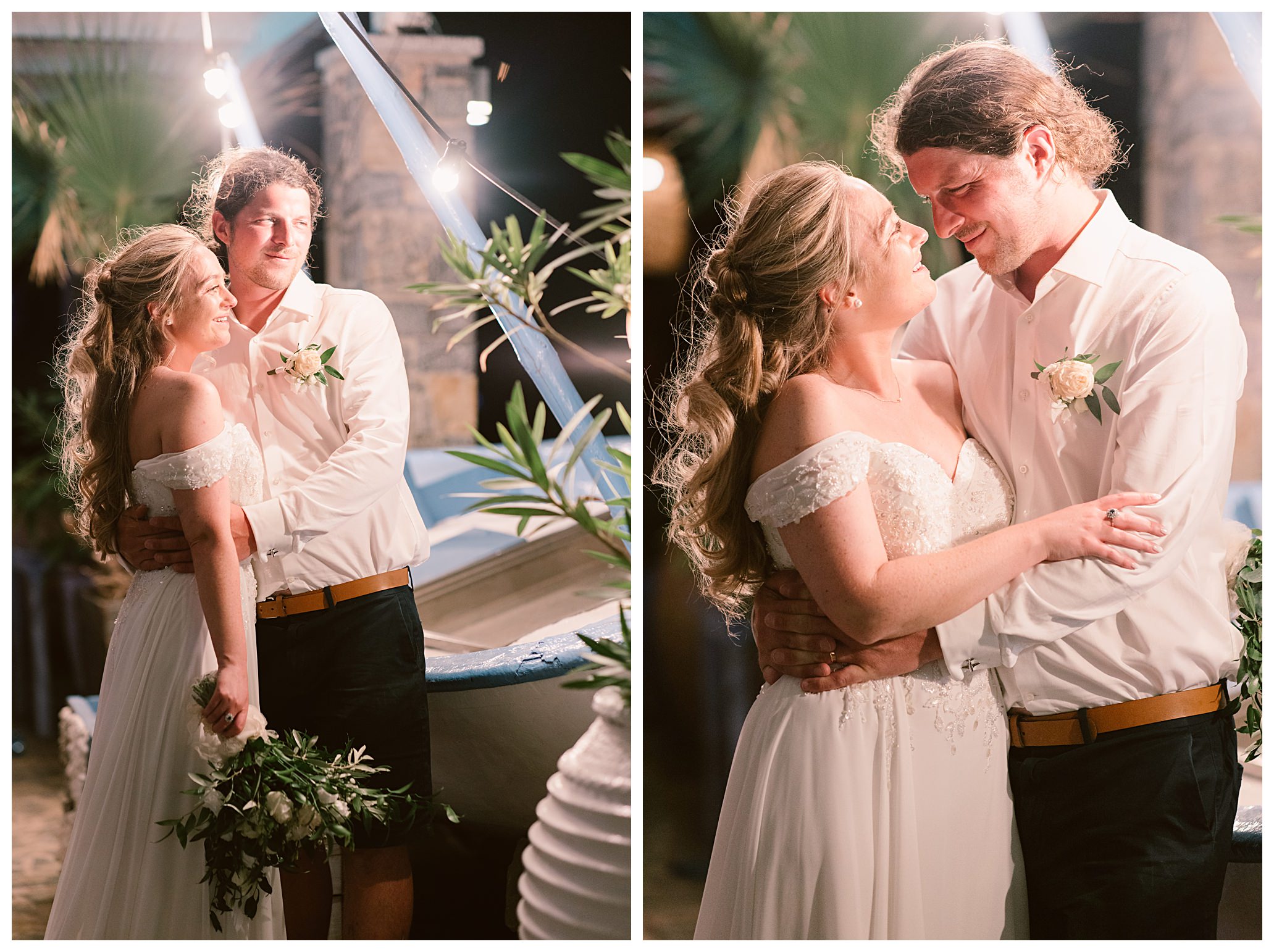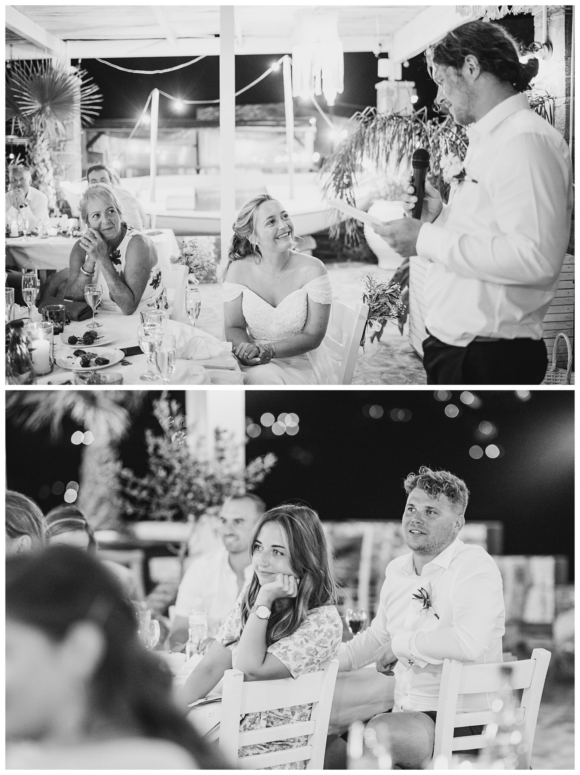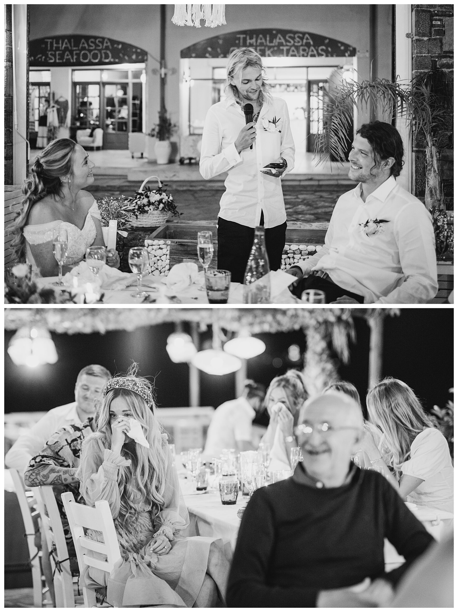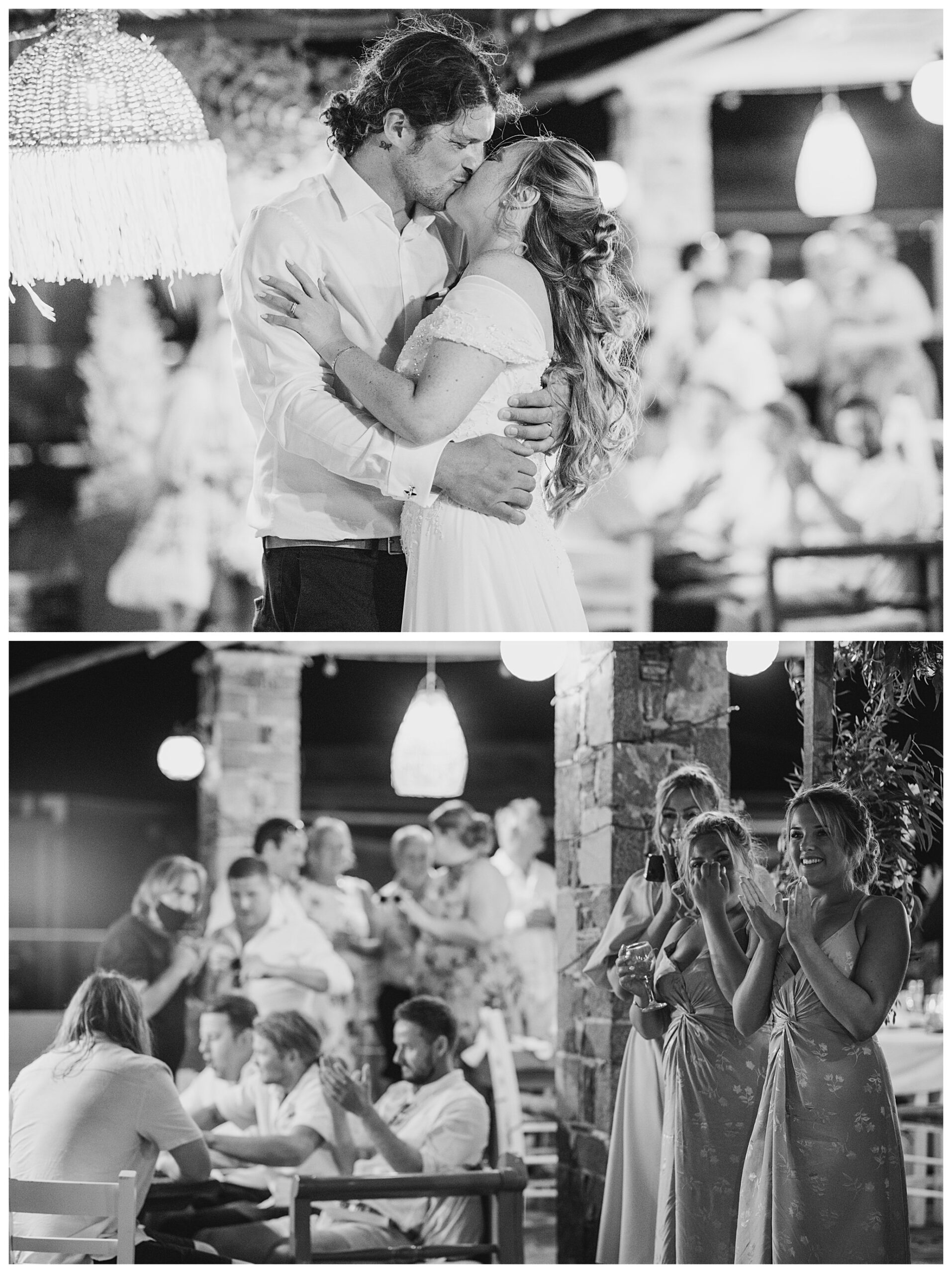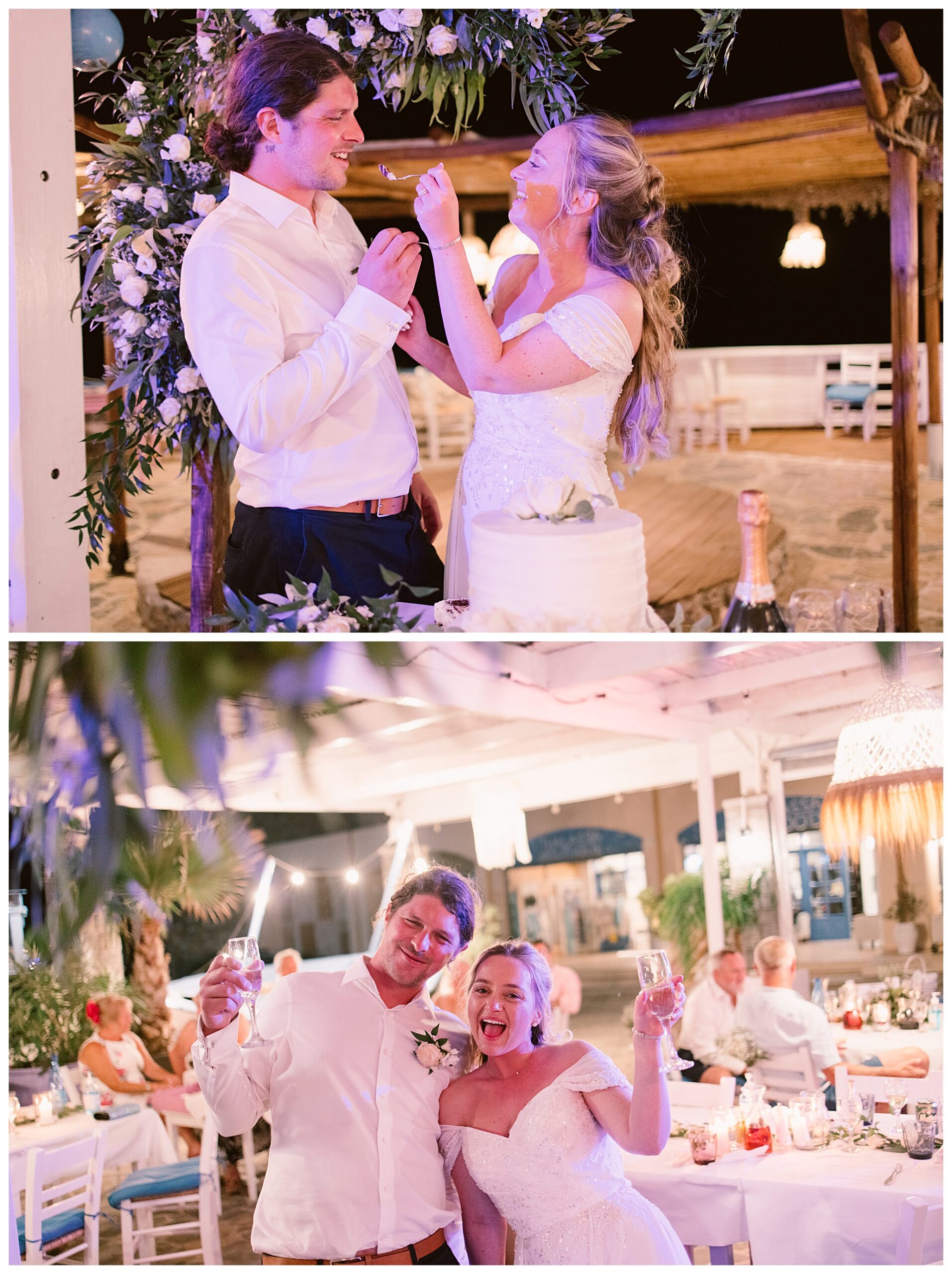As we unexpectedly ended up spending a bit of time taking some photos by the huge puddle, we were running late for the boat, so Dan & Daisy’s lovely wedding planner, Janet from Crete Weddings drove us to the boat where we sailed for about an hour until we moored up at sunset in Plaka, where Dan & Daisy had their wedding reception at a lovely restaurant on the sea front called Thalassa. They had some delicious traditional Greek food, then did their speeches, cut their cake and then danced the night away.