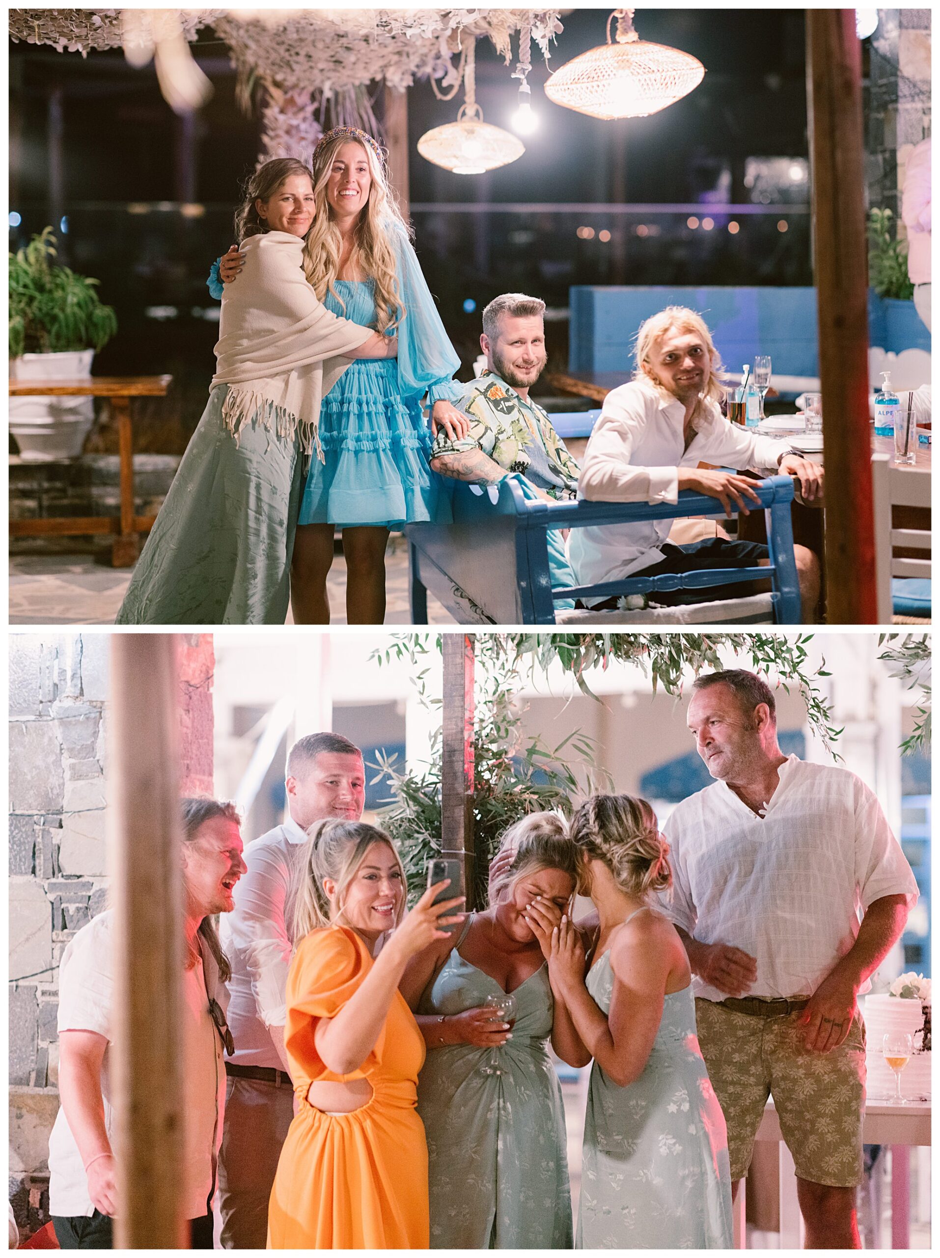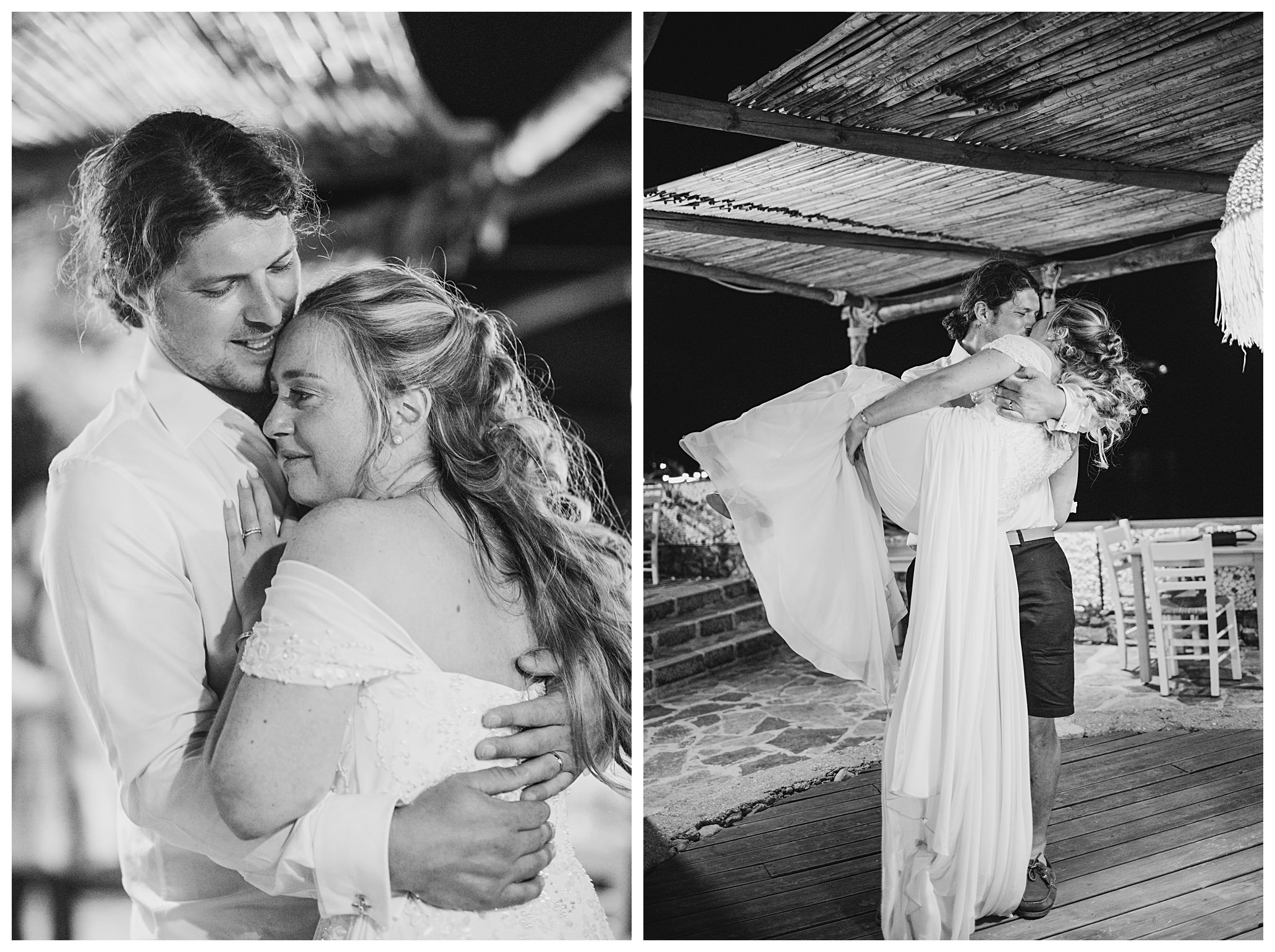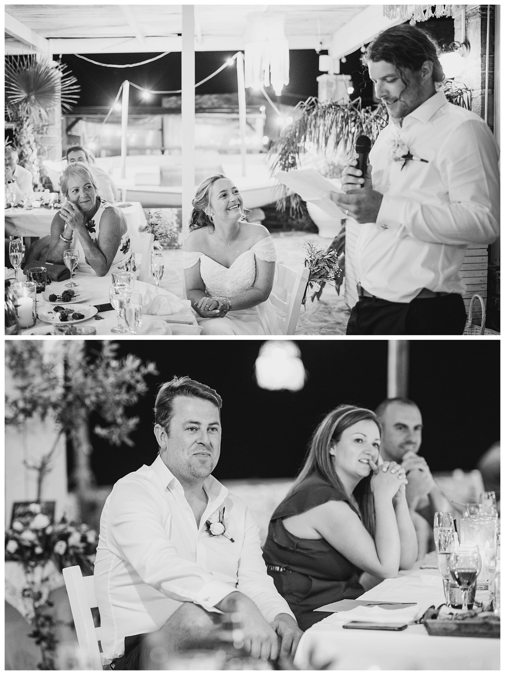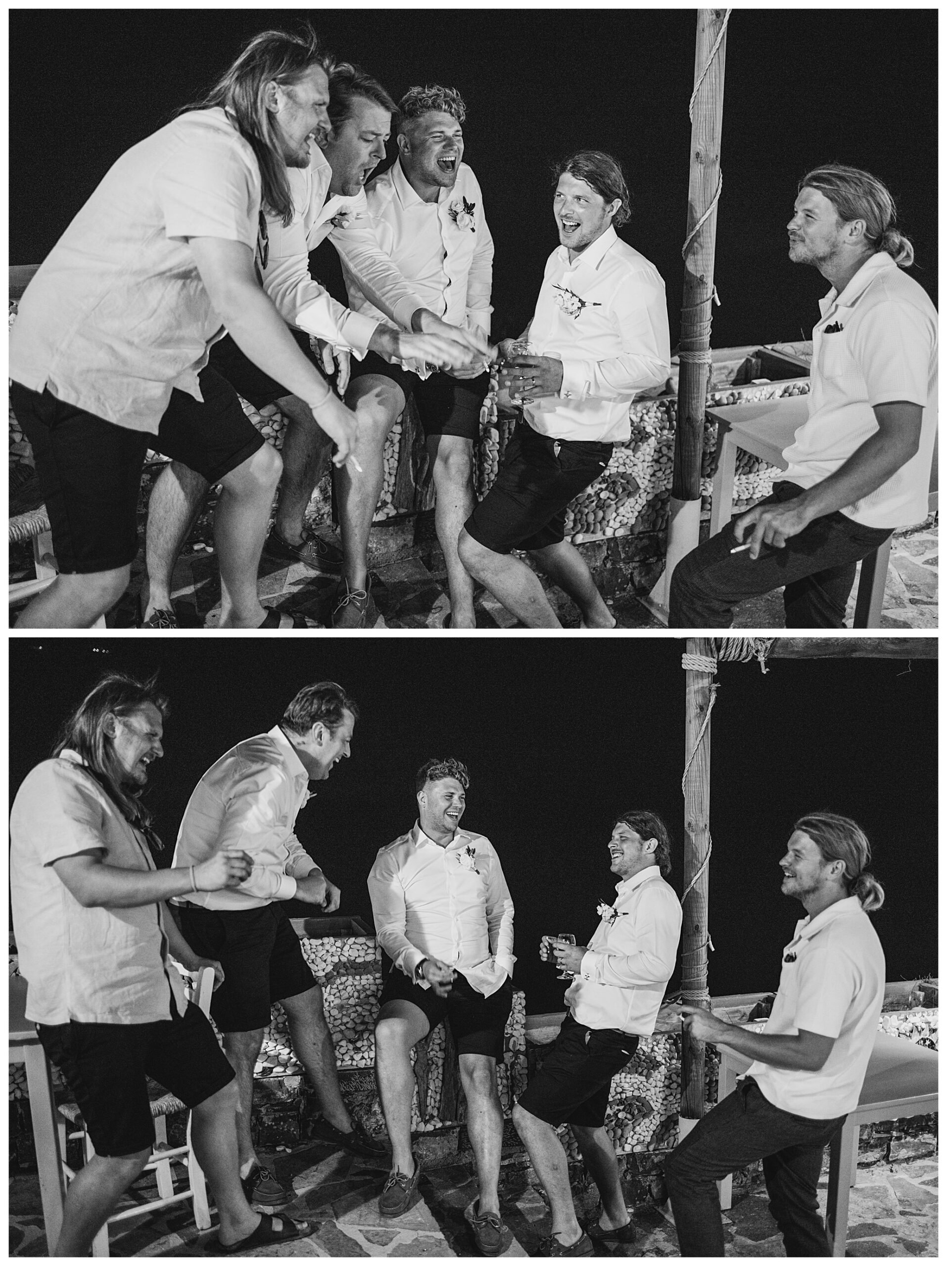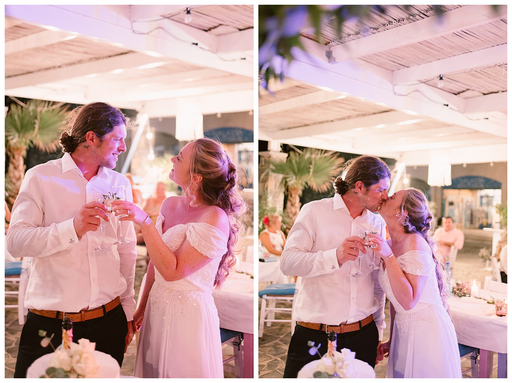 As we unexpectedly ended up spending a bit of time taking some photos by the huge puddle, we were running late for the boat, so Dan & Daisy’s lovely wedding planner, Janet from Crete Weddings drove us to the boat where we sailed for about an hour until we moored up at sunset in Plaka, where Dan & Daisy had their wedding reception at a lovely restaurant on the sea front called Thalassa. They had some delicious traditional Greek food, then did their speeches, cut their cake and then danced the night away.